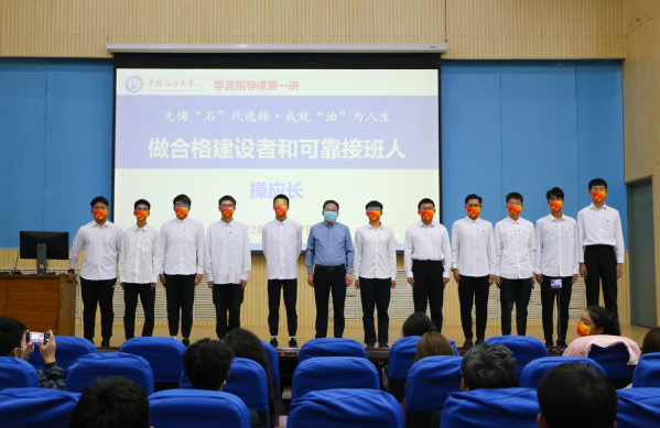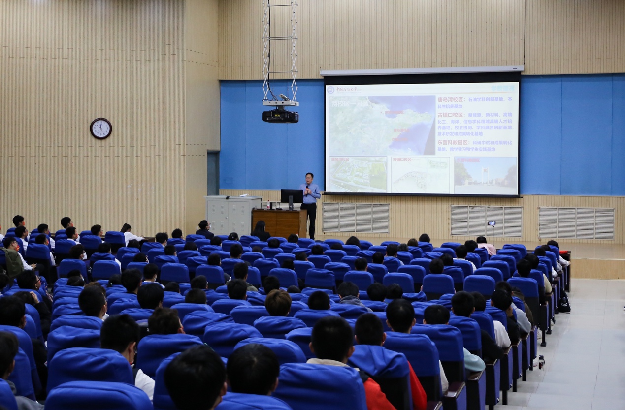 操应长引用教育部原党组书记、部长陈宝生在2019年来校调研时的讲话,向新生介绍学校、学院的光荣历史。他指出,石大的发展历程就是一部石油精神的传承史,作为新中国第一所石油高等学府,学校援建了全国其他石油高等院校,参建了所有石油石化企业,培养了一大批杰出人才,为科学研究、人才培养、文化传承作出卓越贡献。“70年来,我们的建校经历是艰难困苦的,但这不可磨灭的记忆造就了今天石大的卓越。”操应长用时间轴线将一幅幅波澜壮阔的画面串连,让学生身临其境地感受石大发展历史。从北京“九间房”到东营盐碱地,从唐岛湾填海建校,到当前“两校区一园区”的全新发展格局,“面向未来,我们未来的发展愿景,就是将学校建设成中国特色能源领域的世界一流大学!”