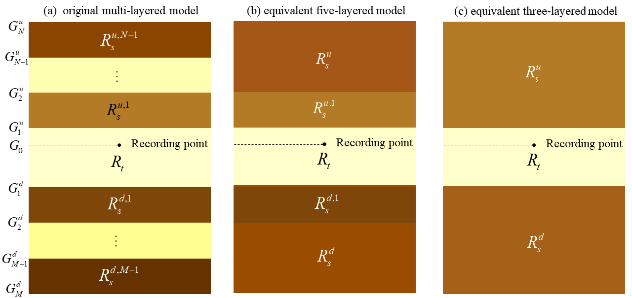 为此,论文提出了物理+数据驱动逼近正演方法和层状阵列侧向测井数值几何因子理论。首先,建立一维(柱状或水平)层状介质模型,基于有限元产生高精度、全标签化数据库。进一步,引入神经网络算法,建立地层模型与视电阻率响应的隐式关系。两者结合将传统刚度矩阵求解转化为一系列小矩阵的运算,极大简化计算复杂度。数值几何因子等效计算的关键是将地下介质看成一系列地层电阻的串联。柱状成层介质中,可以认为测井响应是由侵入带电阻率和原状地层电阻率串联的结果。相比而言,水平层状介质中,受到仪器对界面敏感性的影响,测量点的测井响应受到上下一定范围以内的地层电阻率的影响较大,而这一范围内层的数量无法确定。通过几何因子将多层模型等效成三层或五层模型可以很好地减少建模过程中参数无法确定或参数过多的困难。