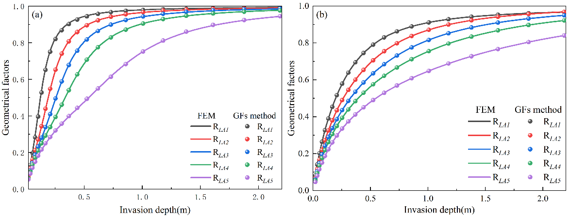 图3. 三维几何因子和有限元阵列侧向测井正演响应对比