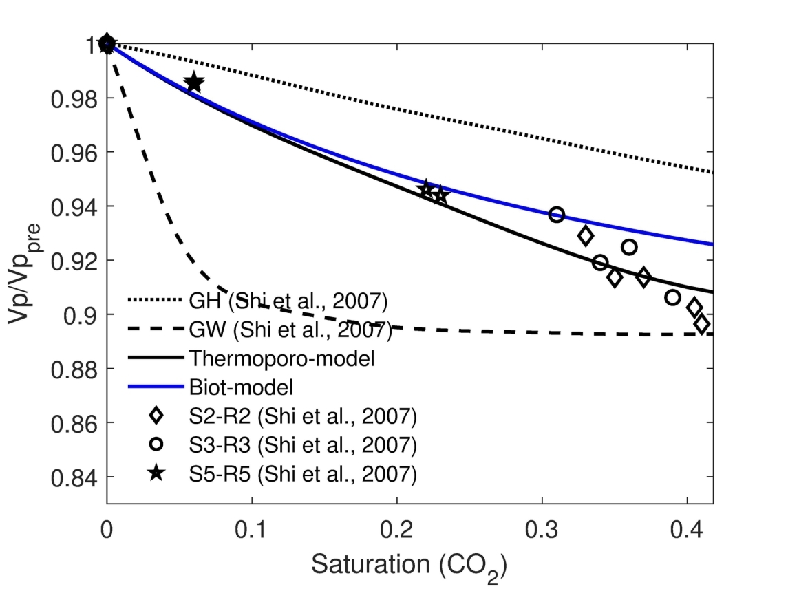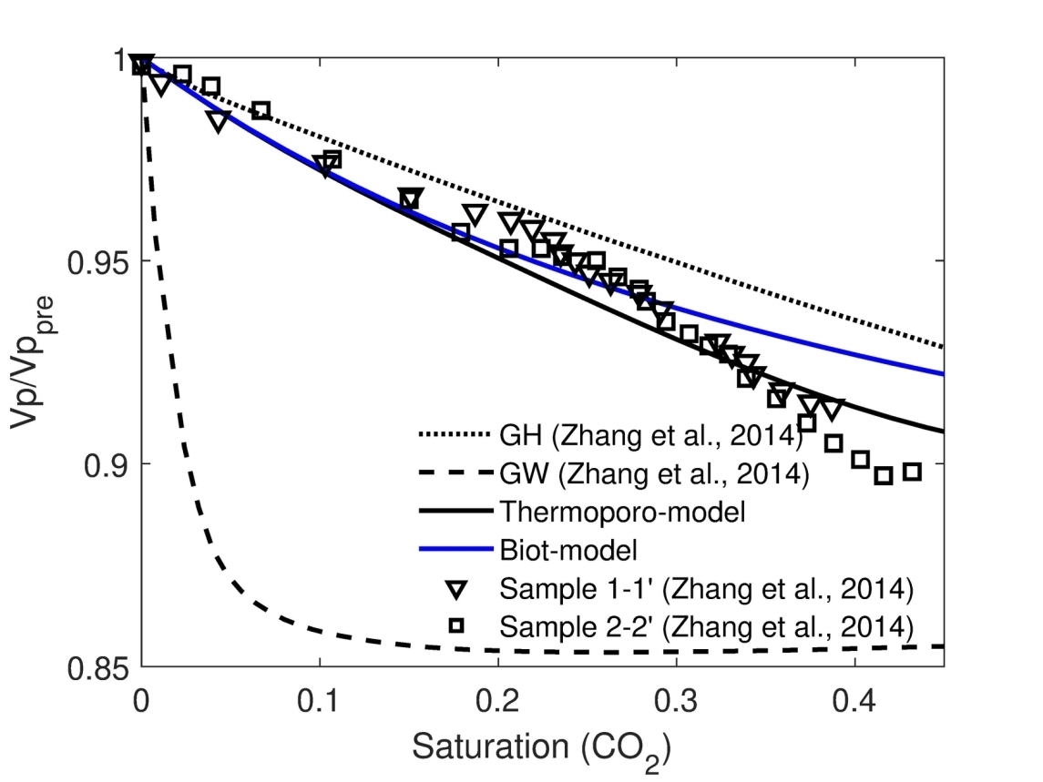 图4. TTG模型预测和实验室测量的P波速度比与scCO2饱和度的关系