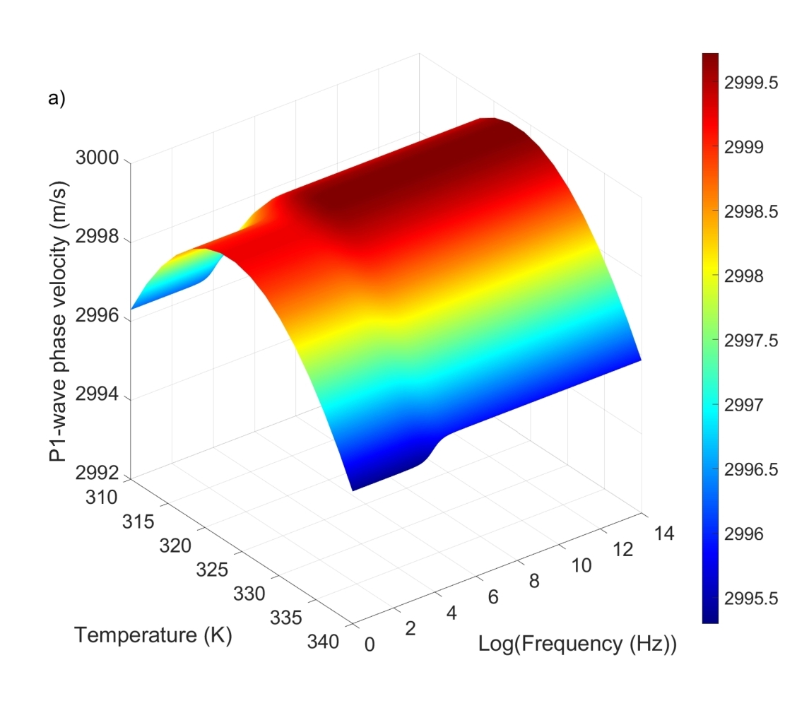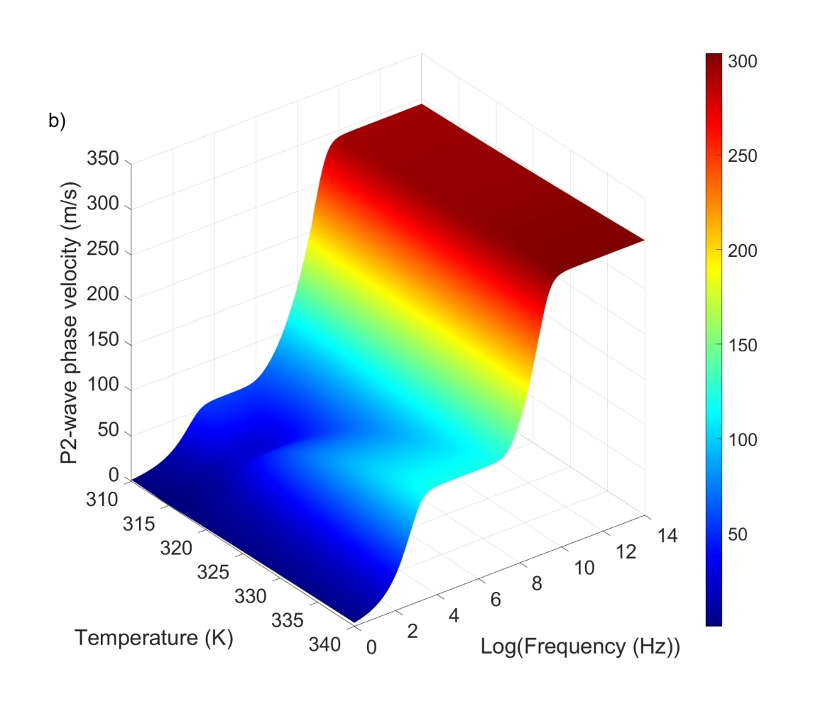 图1. scCO2饱和砂岩中快P波(a)、慢P波(b)的相速度与频率和温度的变化关系