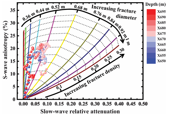 受上覆岩层压力和构造应力的作用,深层岩石通常发育竖直裂缝,产生著名的横波分裂现象,造成显著的横波各向异性和衰减,这在深井的声波各向异性测量中十分常见。研究裂缝引起的这些现象具有理论意义和实际重要性。通过将裂缝散射理论应用于含垂直裂缝的饱和流体岩石,本文研究了竖直裂缝对岩石介质中横波模量、各向异性和衰减各向异性的频率响应,包括裂缝-背景波致流体流动和裂缝面弹性散射两种机制。